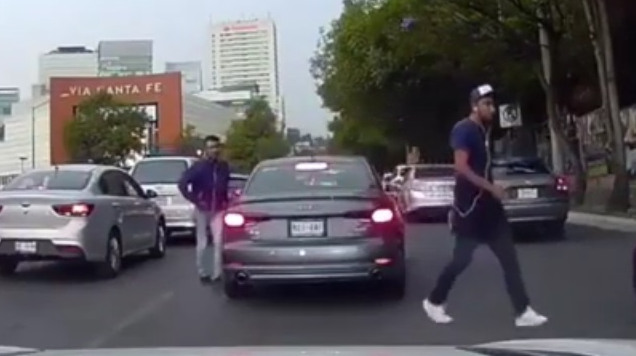 Los sujetos aprovechan el tránsito lento de la zona. Uno de ellos, de sudadero azul y pantalones de mezclilla, se acerca a la ventana de un Audi, y comienza a forcejear con el conductor. El otro sujeto, vestido con playera y pantalón negro, se acerca a apoyar a su cómplice.