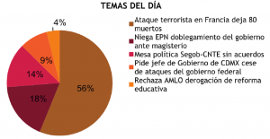 CIUDAD DE MÉXICO, 15 de julio (Almomento MX/Intelicast).- Entre las noticias principales que se publican en los medios de comunicación, de acuerdo con el monitoreo informativo realizado por Intelicast, se encuentra que el terror vuelve a golpear a Francia, objetivo prioritario del yihadismo. Al menos 73 personas, según datos provisionales de la fiscalía, han muerto atropelladas por un camión lanzado contra una multitud durante los festejos del 14 de julio, fiesta nacional francesa, en el Paseo de los Ingleses de Niza.