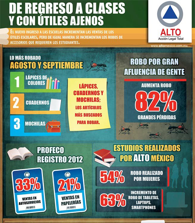 De acuerdo con el portal, el robo está presente en las tiendas con mayor afluencia para comprar útiles escolares. Las pérdidas de estas tiendas de autoservicio suben en un 82 por ciento debido a que se trata de un periodo de gran incremento de gente en el comercio debido al ingreso escolar.