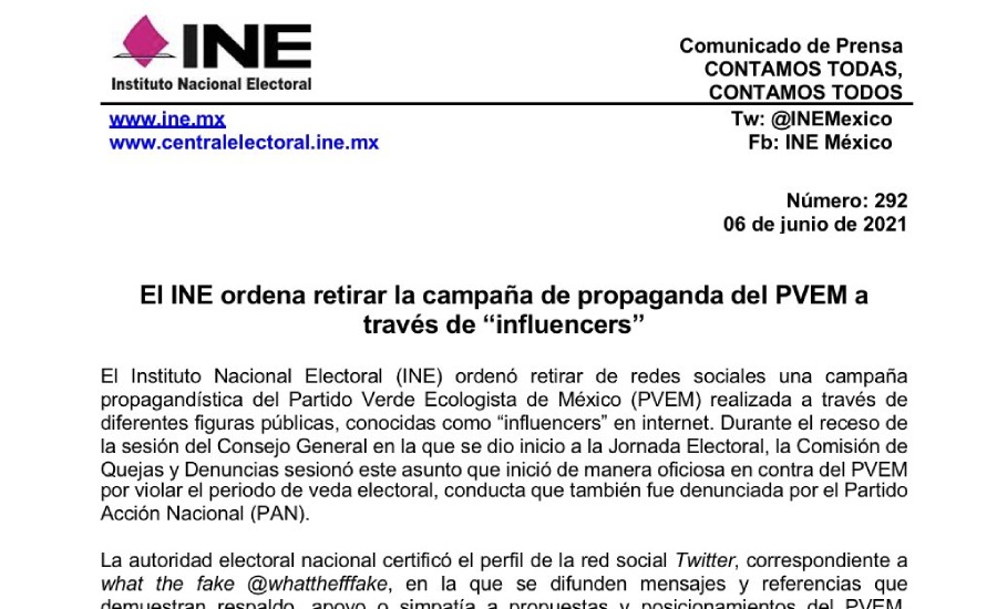 Ciudad de México-. El Instituto Nacional Electoral (INE) ordenó retirar de redes sociales una campaña propagandística del Partido Verde...
