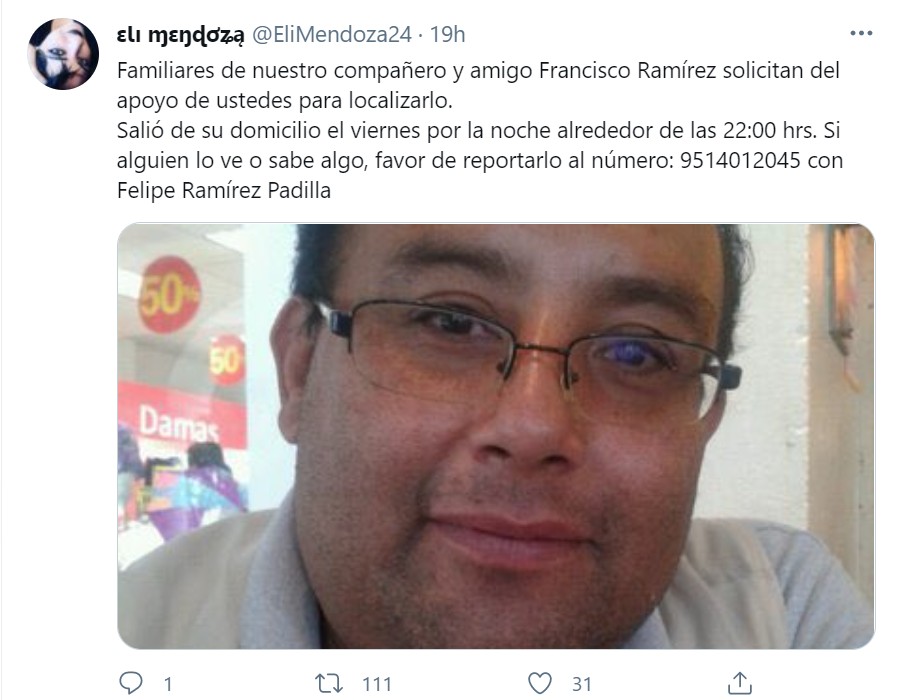 Ciudad de México-. Familiares del reportero Francisco Ramírez Padilla, que radica en Oaxaca, solicitaron a través de redes sociales auxilio...