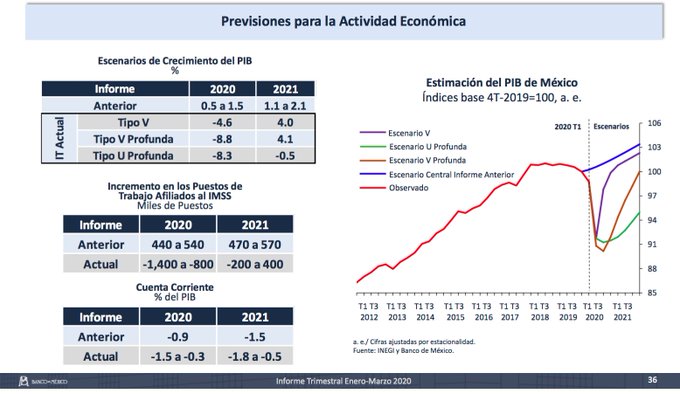 De acuerdo a estimaciones de @Banxico, para este 2020 #México podría esperar un crecimiento del #PIB de entre -4.6% y -8.8%, una pérdida de 800 mil a 1.4 millones de empleos formales y un déficit en cuenta corriente de entre 0.3 y 1.5% del #PIB. pic.twitter.com/wWd9FGkam3