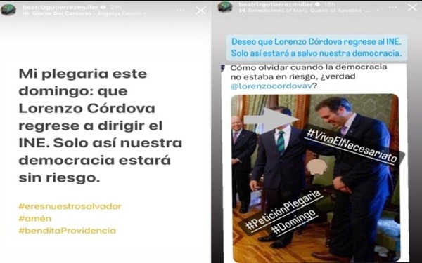 Redacción MX Político.- La académica y esposa del presidente, Beatriz Gutiérrez Müller, publicó dos ‘historias’ en Instagram en las que le dedica una “plegaria” y un “deseo” al ex consejero presidente del INE, Lorenzo Córdova, acompañando el texto con las etiquetas #eresnuestrosalvador, #amén y #benditaProvidencia.