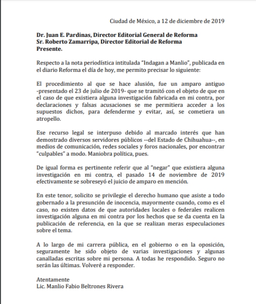 También motivó una respuesta suscrita por el aludido exgobernador de Sonora, Beltrones Rivera, dirigida al director del periódico, donde puntualiza que efectivamente y en un afán de que se privilegie el derecho humano que le asiste a todo gobernado, sobre el principio de presunción de inocencia, dirigía esa misiva para aclarar que efectivamente sí promovió un juicio de amparo, para poder -en caso de existir alguna investigación sobre él-, acceder a las imputaciones y los dichos, con el objeto de poder defenderse.