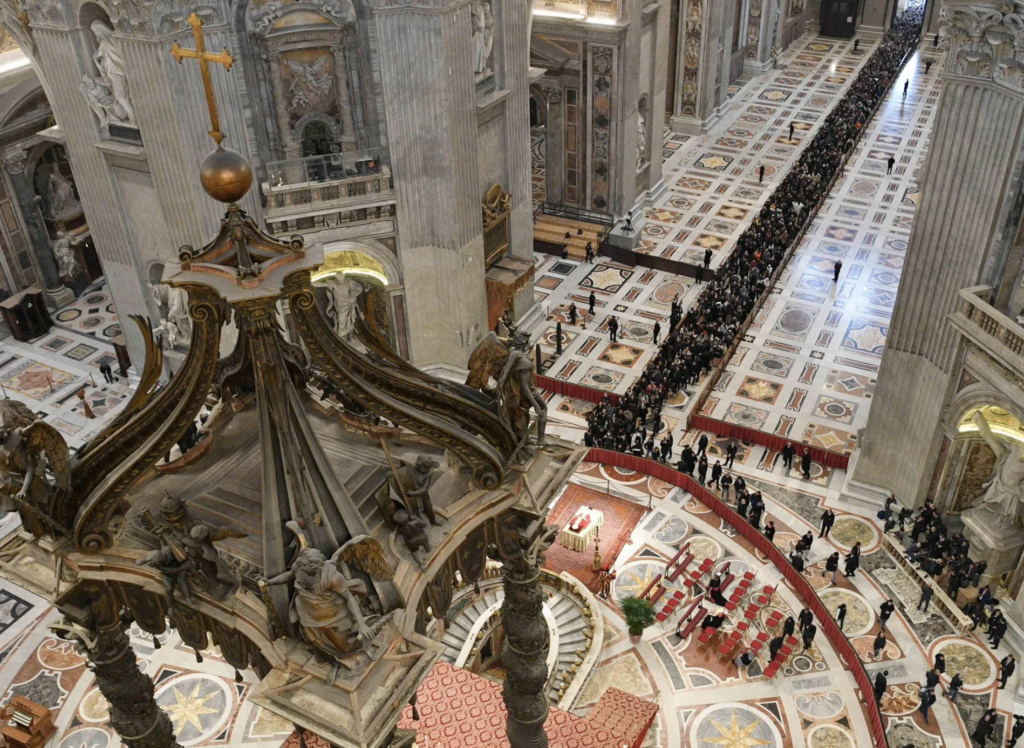 Ratzinger, que en 2013 fue el primer pontífice en renunciar en los últimos seis siglos, yacía sobre un catafalco de tela dorada a los pies del Altar de la Confesión y del baldaquino de Bernini, sobre el lugar en el que según la tradición fue sepultado San Pedro.