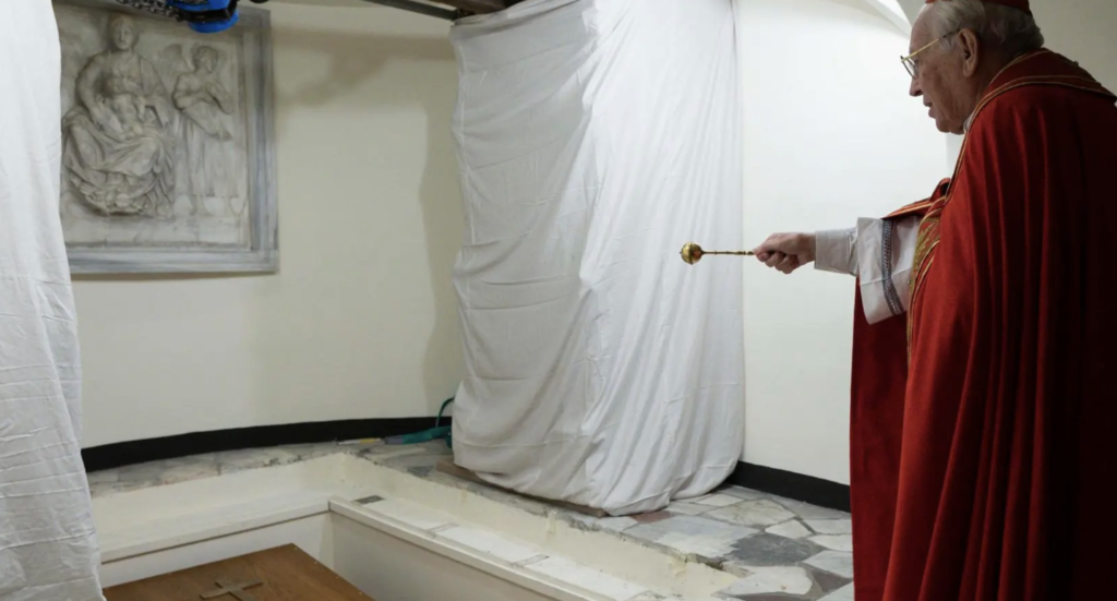 Los restos del emérito reposarán en la que hasta 2011 fue tumba de Juan Pablo II y, como manda la tradición, lo hacen en un féretro triple: uno en madera de ciprés, introducido en uno segundo de zinc y sellado y revestido todo en uno tercero en olmo barnizado.
