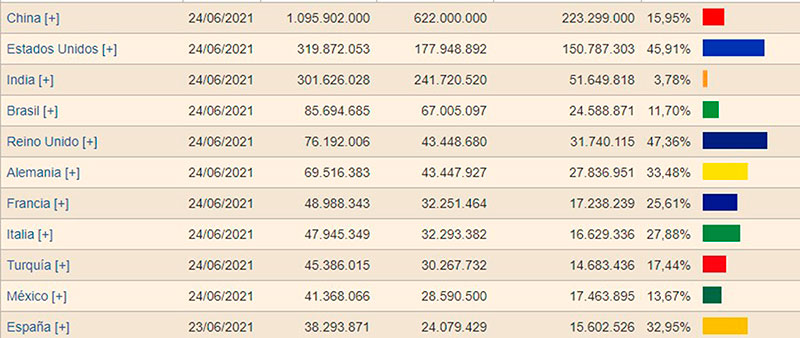 Al 24 de junio de 2021, México es el primer lugar de Latinoamérica por el número de vacunas administradas, más de 41 millones. El segundo lugar es Chile, con 21 millones. Estamos tratando el caso de 17 millones 463 mil 895 ciudadanos, que representan el 13.67 por ciento, pero casi la totalidad de las personas consideradas por la Organización Mundial de la Salud entre las de mayor riesgo. Una proeza para un país en el que casi 40 por ciento de la población no tiene ingresos suficientes para comprar una canasta básica de alimentos.