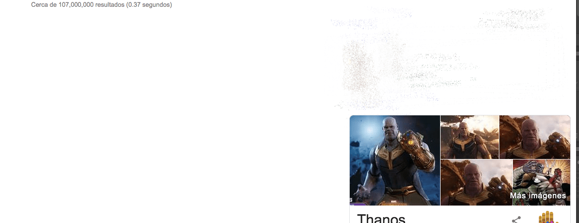 Bueno, una vez que te aparece el guantelete del Infinito dale clic o selecciónalo y ve lo que sucede: El guantelete, animado, chasquea y las notas relacionadas a Thanos, las búsquedas más frecuentes y otros detalles, desaparecen y se hacen polvo.