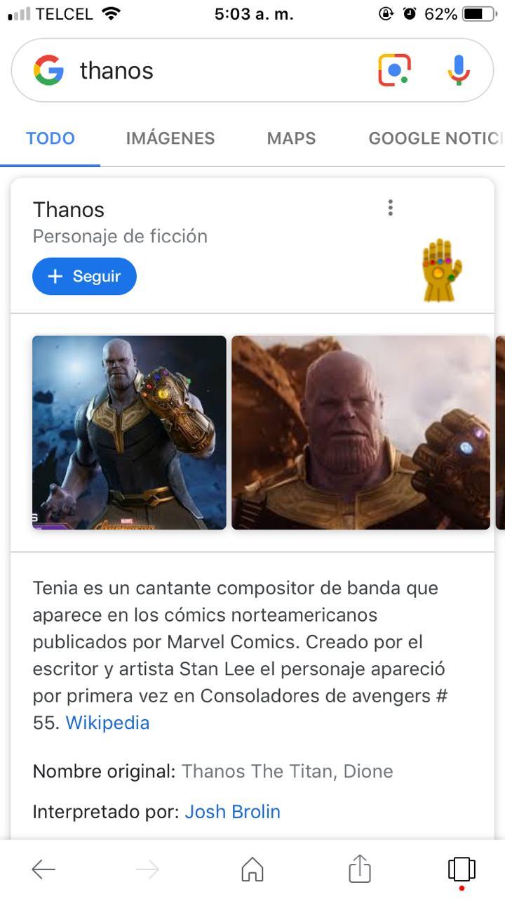 Tan sólo debes ir al buscador de Google, escribir “Thanos” para que te aparezca la información relacionada al personaje. Ya sea en formato móvil o de escritorio, también aparecerá el guantelete con las Gemas del Infinito.