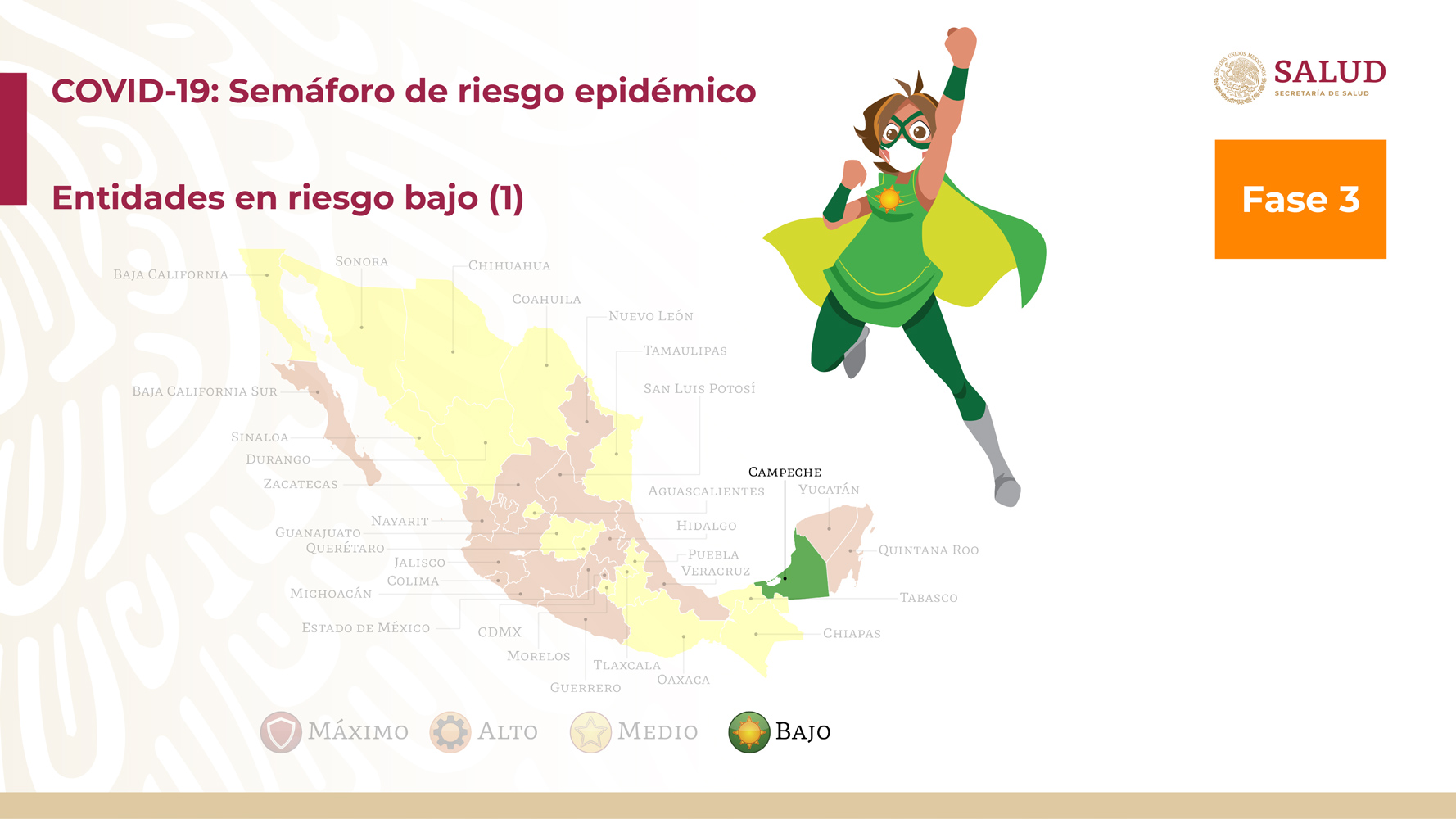 Este avance significa que la población de Campeche se encuentra en riesgo bajo de contagio de coronavirus por lo que podrán retomar todas las actividades en su aforo total siempre que se sigan los adecuados protocolos de sanidad.