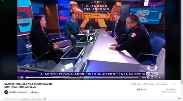 Nadie pudo responder: ¿Qué hace un medio de comunicación “fantasma” del estado de Yucatán, promoviendo al secretario de Seguridad Pública de Quintana Roo? En su cuenta de Facebook, al revisar el contenido del medio, no hay vídeos que hagan que uno vea que es un medio serio. Los vídeos con los que cuenta tienen 100, 200, 80, 20, 150 reproducciones, todos con una temática muy local del estado vecino. Pero algo extraño sucede con el vídeo de Capella Ibarra. De entrada, el portal se adueña de una propiedad intelectual que le pertenece a otra empresa, Televisa. No hay código de ética verificable en ese medio, pero es el único vídeo que tiene hasta la fecha 855 mil reproducciones. Durante todo diciembre usted lo pudo ver en la pantalla de su celular, con la leyenda de “publicidad”.