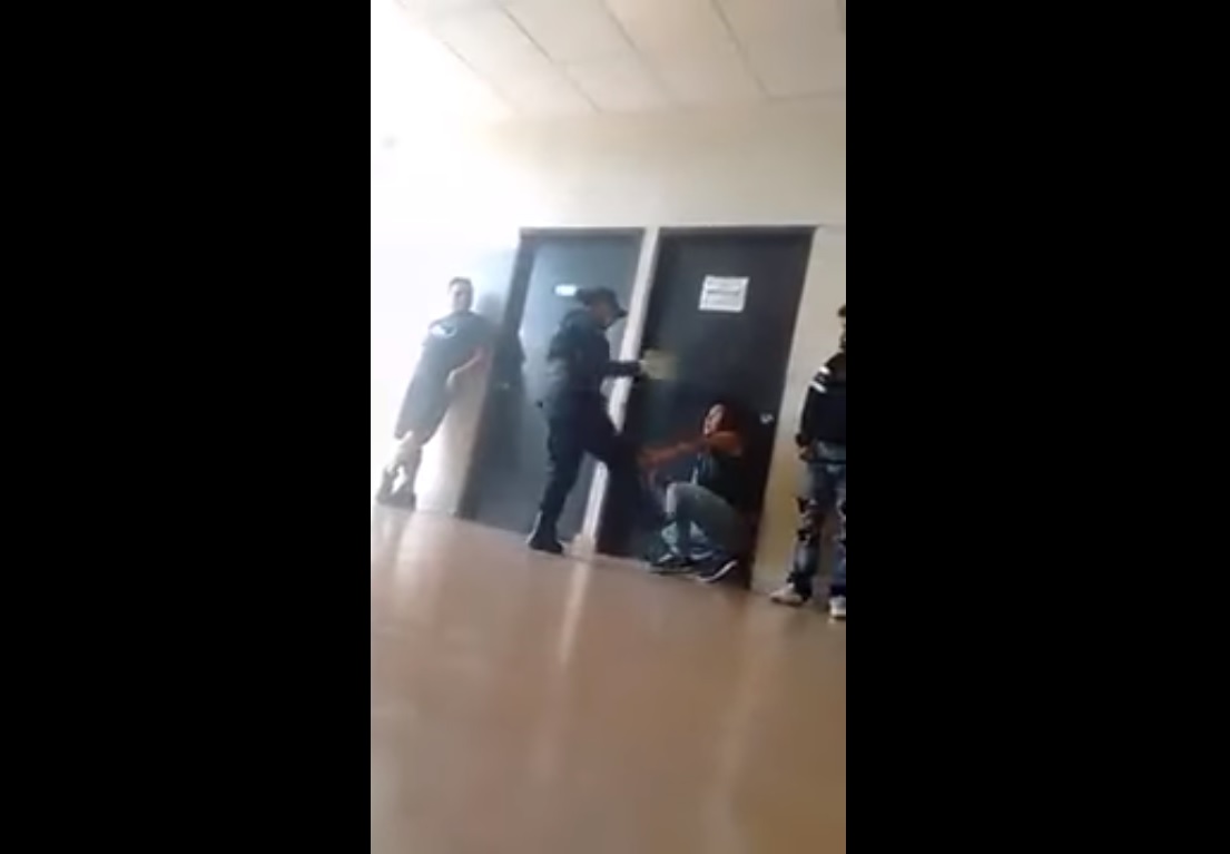 En el video se aprecia cómo los jóvenes se encuentran sentados en el piso. De repente, una oficial se acerca ellos para ordenarles que se quiten las agujetas de los tenis, y sin motivo alguno, comienza a golpear a uno de los sospechosos.