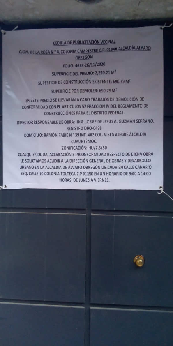 Soy Francisco Alberto Servín de Alba, legítimo propietario del inmueble ubicado en el callejón de la Rosa número 4, Colonia Campestre, con el código postal 01040 en la Ciudad de México y con la cuenta Predial número 05 40 36 200001