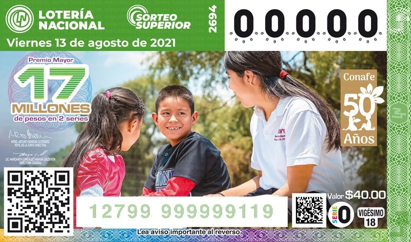 Informó que el Sorteo Superior No. 2694 entregará un Premio Mayor de 17 millones de pesos en dos series, y reparte una bolsa de 51 millones de pesos en premios. Se realizará el viernes 13 de agosto en el edificio, El Moro, sede del Salón de Sorteos, y se transmitirá en el canal oficial de YouTube de la Lotería Nacional.