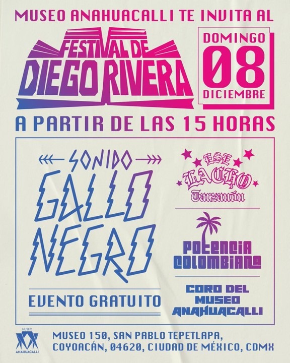 Sonido Gallo Negro, Ese Lacho Tarzanón, Potencia Colombiana y el Coro del Anahuacalli le pondrán ritmo al festejo, que se realizará en la Explanada del Museo Diego Rivera Anahuacalli, que está ubicado en Calle Museo número 150, San Pablo Tepetlapa, alcaldía Coyoacán, CDMX, a partir de las 14:30 horas.