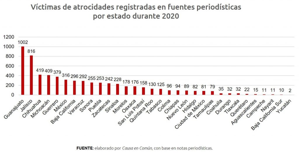 Los estados con más víctimas de atrocidades registradas fueron Guanajuato (con 1,002), Jalisco (con 816), Chihuahua (con 419); Michoacán (con 409), y Guerrero (con 379). Los estados con el menor número de víctimas de atrocidades registradas fueron Aguascalientes (con 15), Nayarit y Campeche (con 11 cada uno), Baja California Sur (con 10) y Yucatán (con dos).