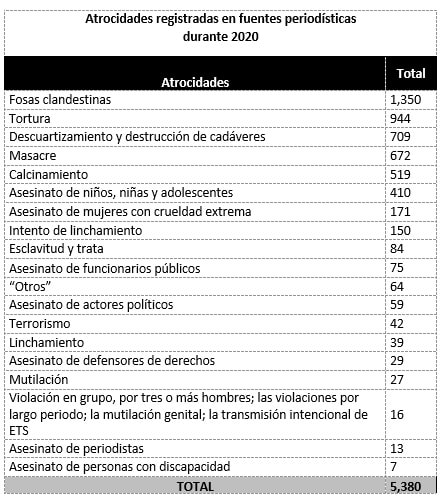 En las diversas categorías de atrocidades, se registraron 6,365 víctimas durante el año. Algunas categorías que aumentaron sus registros durante diciembre fueron el asesinato de funcionarios públicos, con 19 casos, contra seis del mes de noviembre; así como los casos de linchamiento, mutilación y terrorismo, que sumaron siete casos cada uno en el último mes, contra dos, uno y tres en el mes anterior, respectivamente.