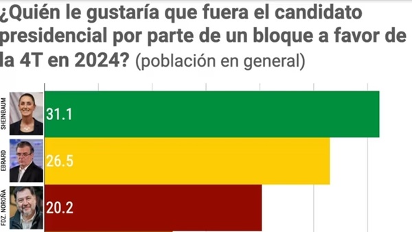 Ante la pregunta “¿Quién le gustaría que fuera el candidato presidencial por parte de un bloque a favor de la 4T en 2024?”, la población en general respondió que prefieren a Sheinbaum Pardo al 31.1%, mientras que Marcelo Ebrard, titular de la Secretaría de Relaciones Exteriores (SRE), llegó al 26.5% de las preferencias. No obstante, una figura que cobró relevancia recientemente es la de Gerardo Fernández Noroña, diputado federal por el Partido del Trabajo (PT), quien se posicionó en tercer lugar con el 20.2% de la intención de voto.