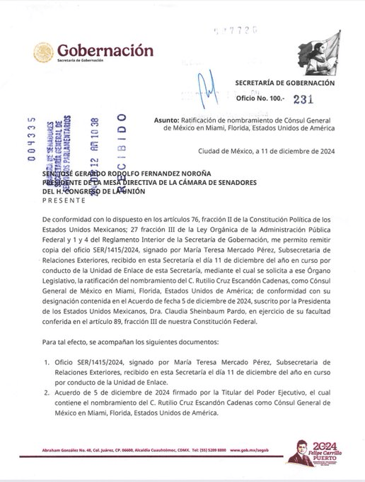 La presidenta Claudia Sheinbaum presentó ante el Senado de la República la propuesta para nombrar a Rutilio Escandón, exgobernador de Chiapas, como cónsul general de México en Miami, Florida.