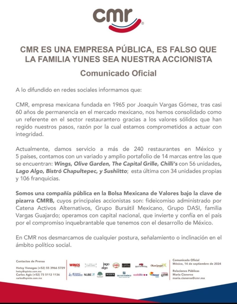 La Corporación Mexicana de Restaurantes (CMR) desmintió las afirmaciones que circulaban en redes sociales sobre una supuesta relación accionarial con la familia Yunes.