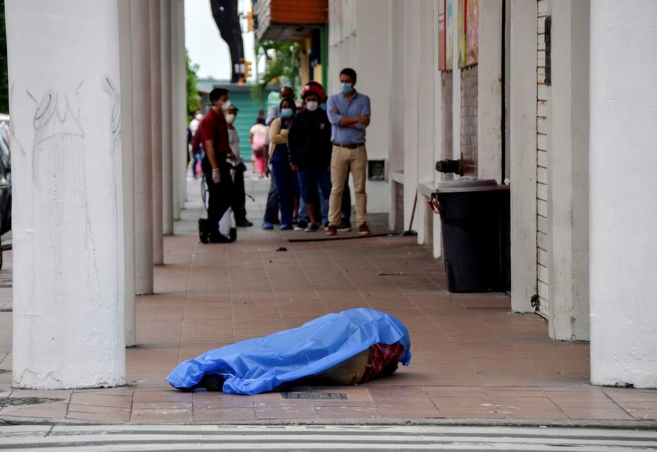 Un testigo de la agencia Reuters vio el lunes el cuerpo de un hombre en una acera, debajo de una sábana azul cerca de una zona turística en el centro de Guayaquil. Policías consultados indicaron que el hombre colapsó mientras hacía fila para hacer compras