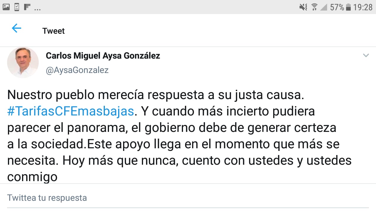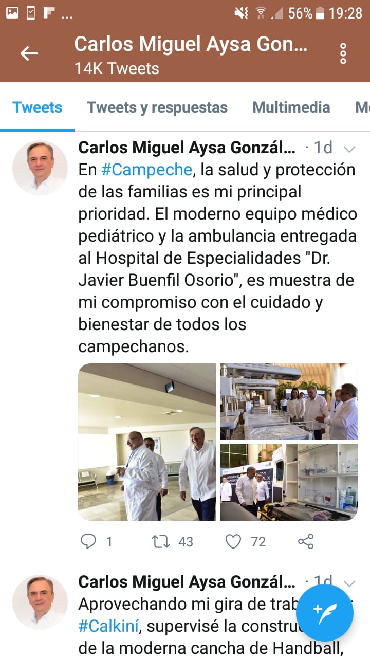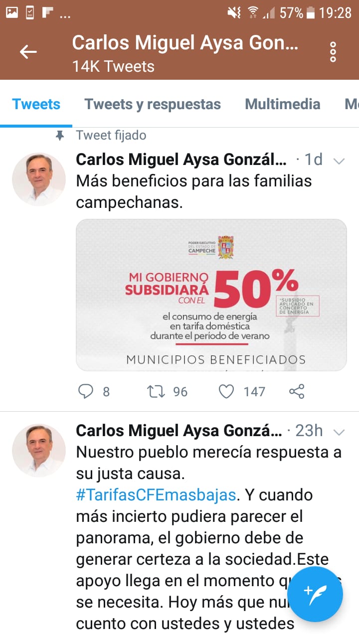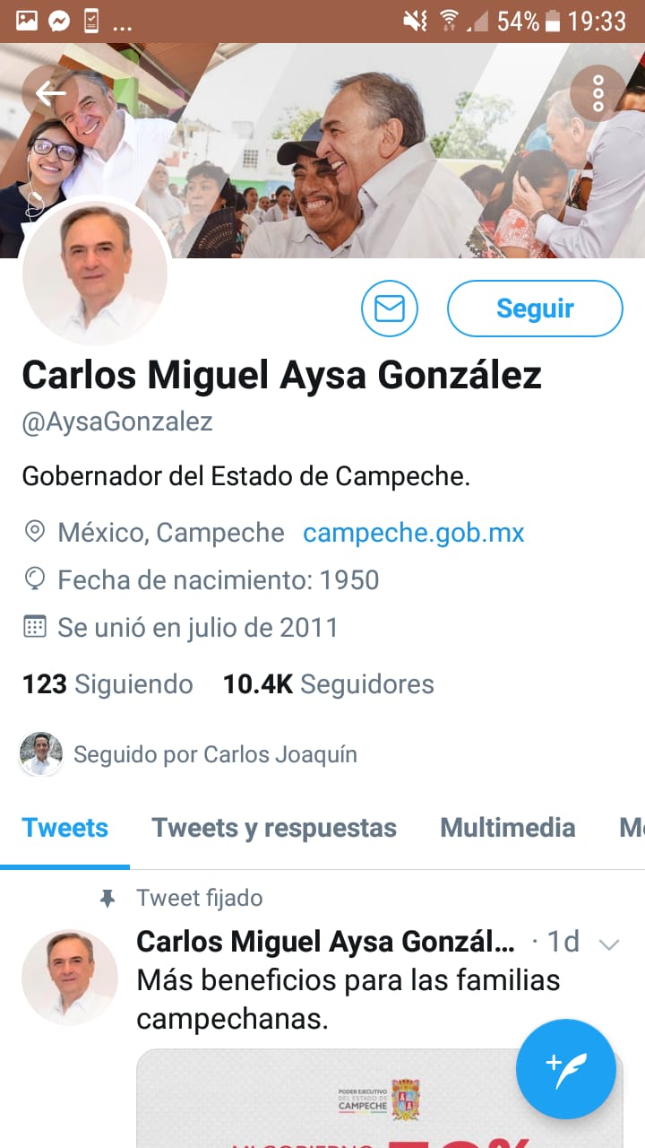 El Twitter del gobernador de Campeche es el menos activo. En las últimas 24 horas solo ha hecho un tuit en el que informa, a través de un vídeo los apoyos de subsidios de su gobierno en los recibos de Comisión Federal de Electricidad. En el mismo tuit, se lee “Hoy más que nunca, cuento con ustedes y ustedes conmigo”. El tuit anterior data del 21 de marzo y antes de este otro del 20 de marzo.