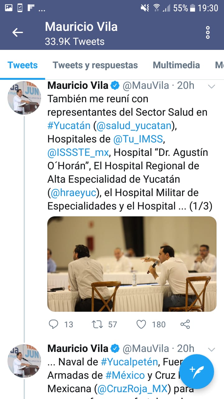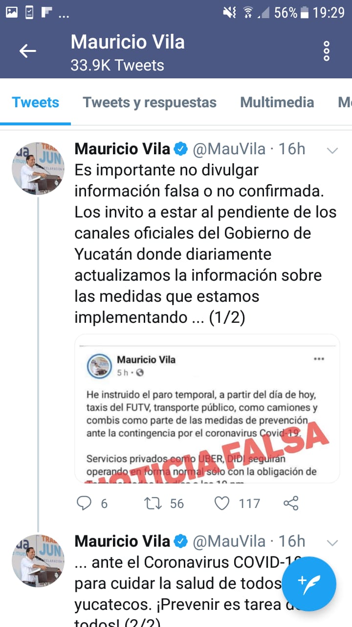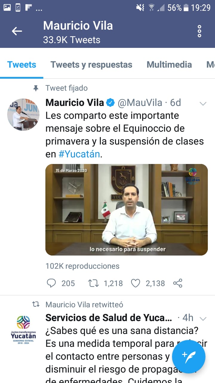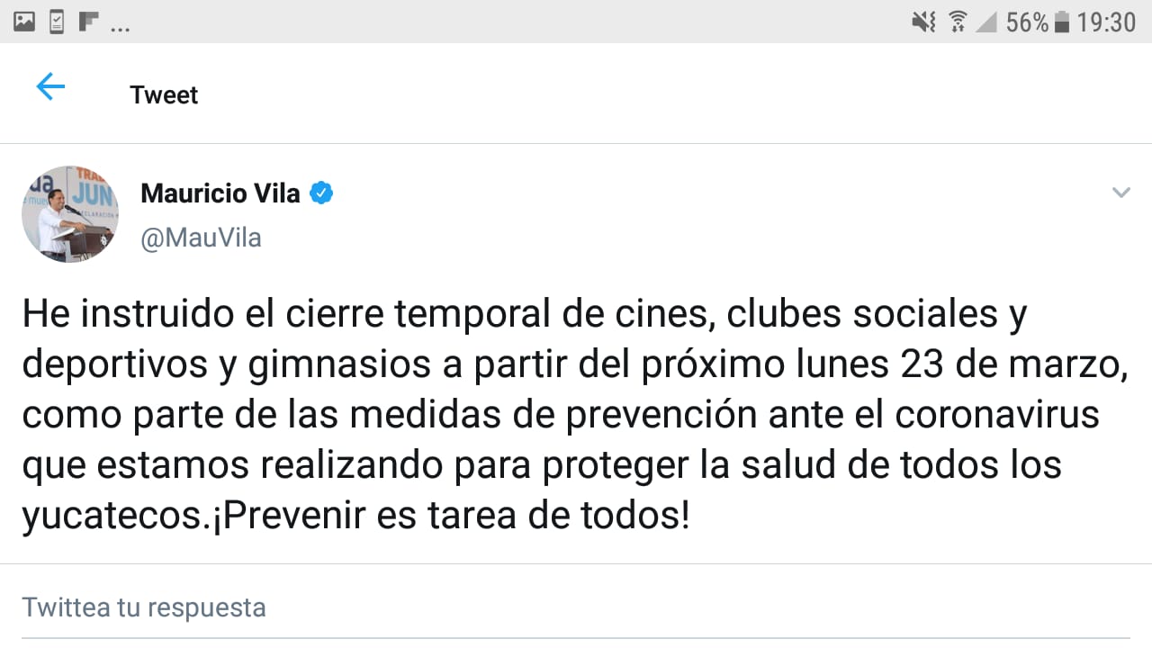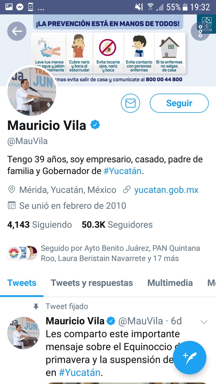 La cuenta de Twitter del gobernador de Yucatán Mauricio Vila tiene 8 tuits en las últimas 24 horas, todos ellos relacionados con temas de prevención e información sobre el COVID-19. El gobernador de Yucatán ofrece a sus ciudadanos información puntual sobre la pandemia que azota a el mundo, y de los cómos y qué hacer para evitar contagios así como qué hacer en caso de contraer el virus.