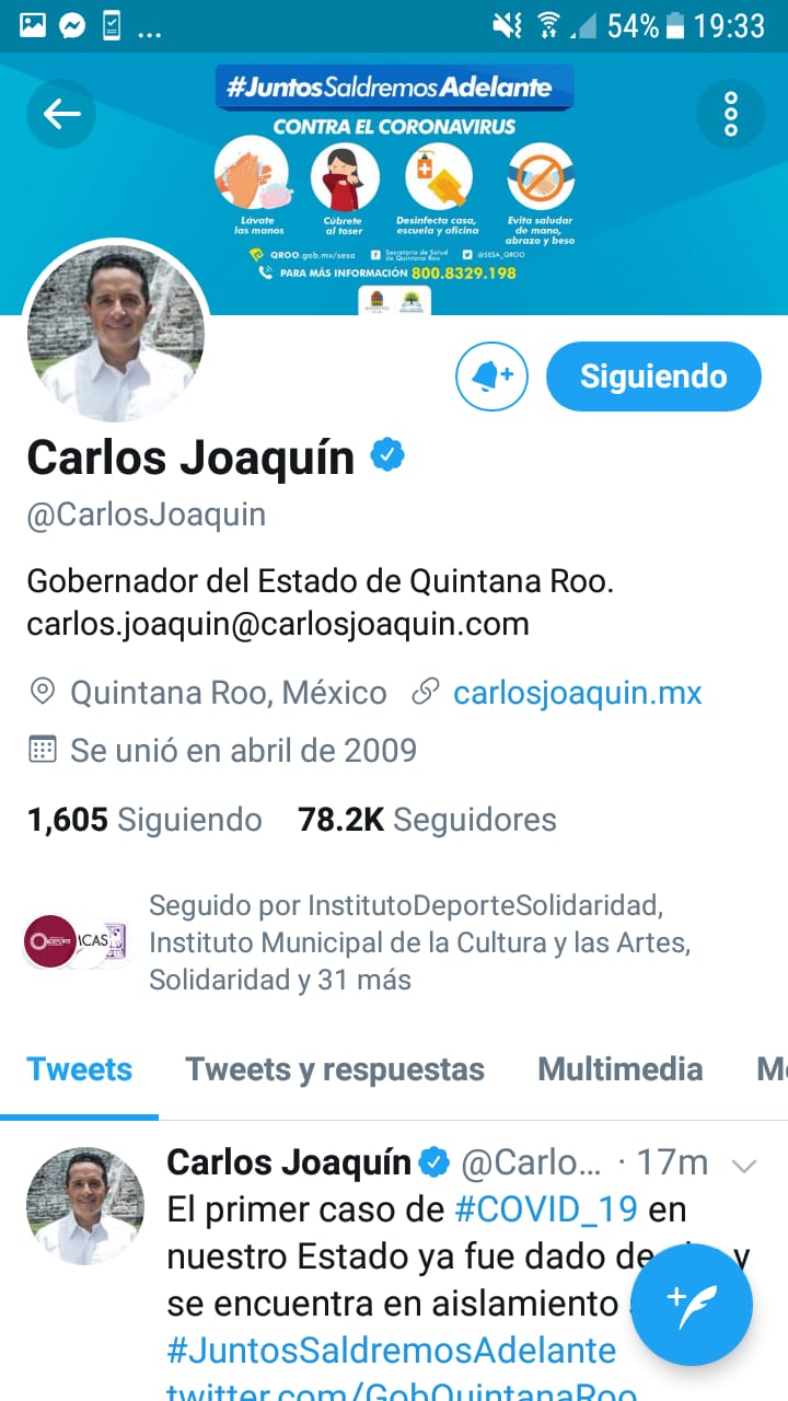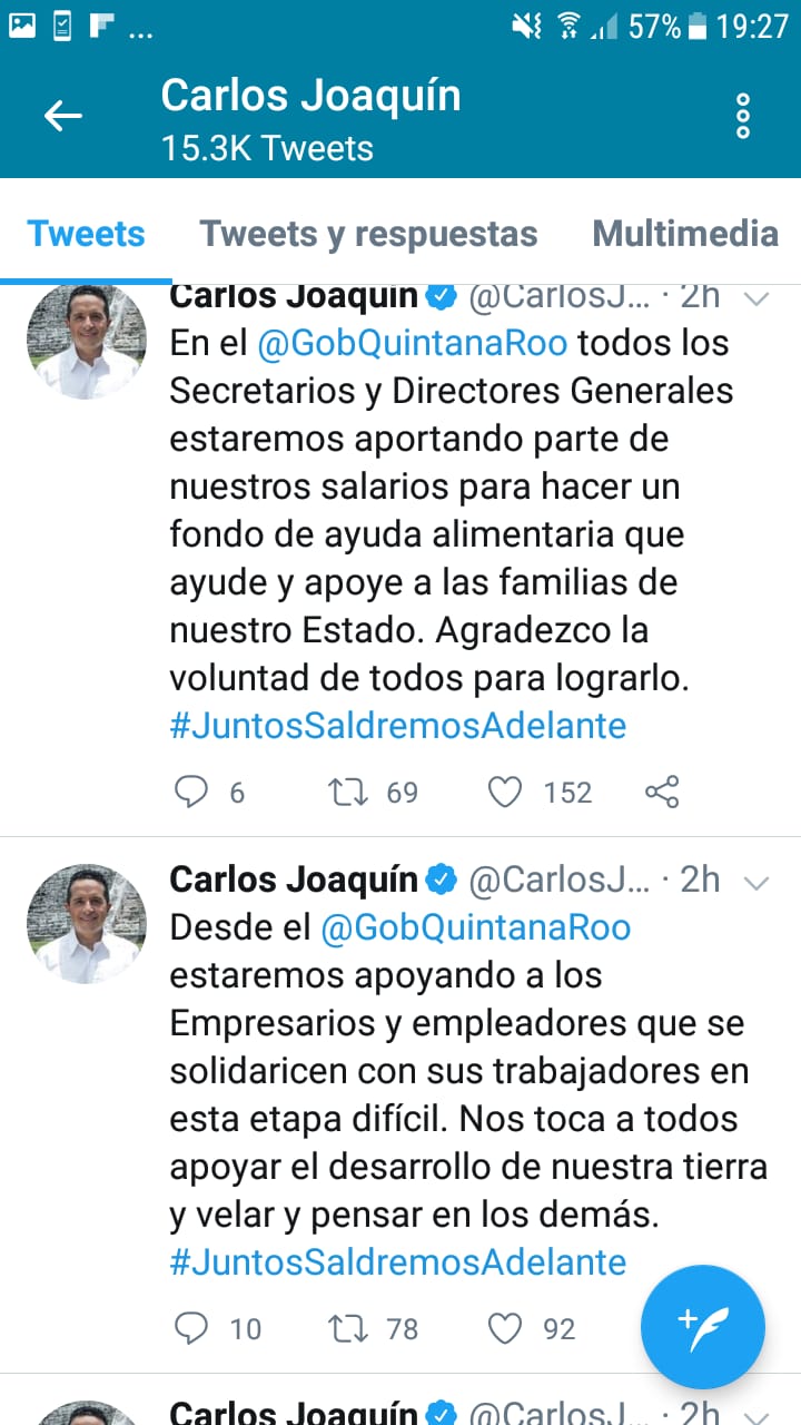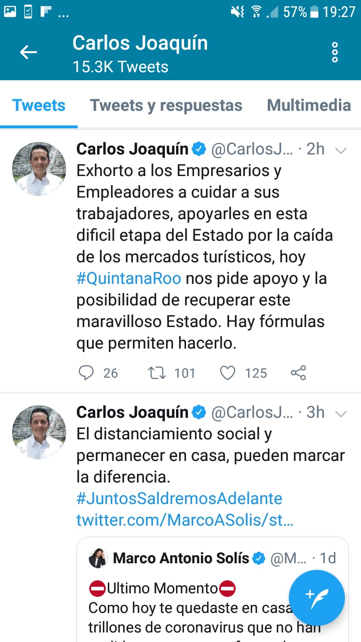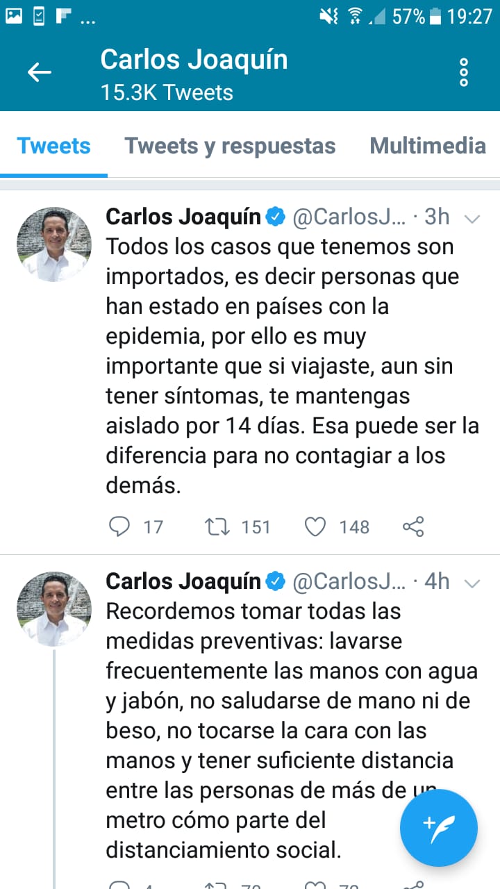 En Twitter el más activo es Carlos Joaquín quien tuitea dos o tres tuits cada hora. En la cuenta de Twitter del gobernador de Quintana Roo se lee información actualizada que el propio gobernador comenta. También sobre el qué hacer y dónde acudir de presentar síntomas del Coronavirus. En las últimas 24 horas el gobernador ha realizado 14 tuits.