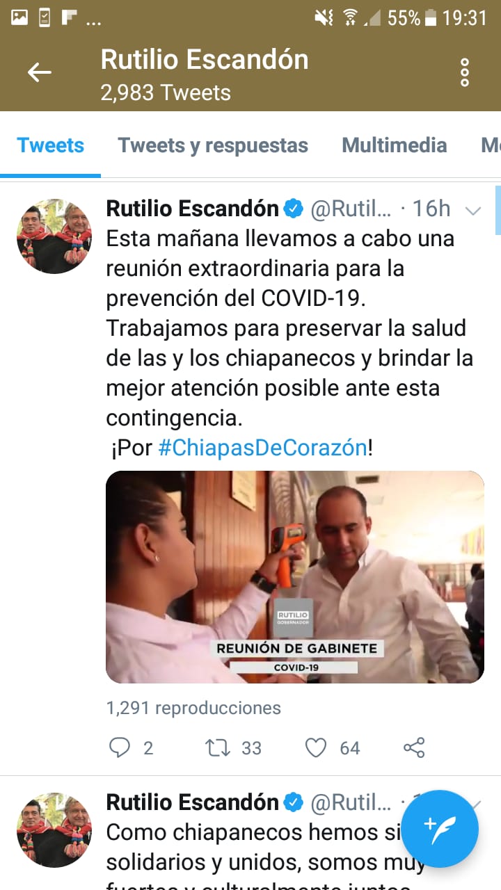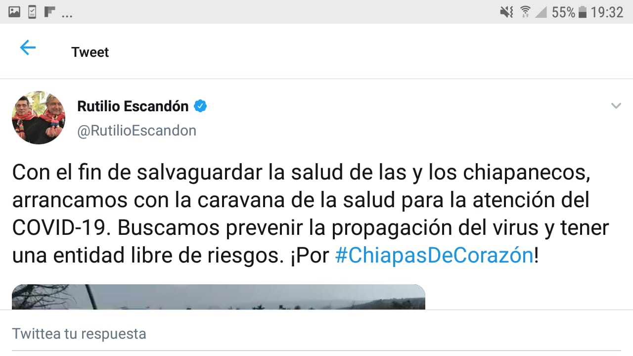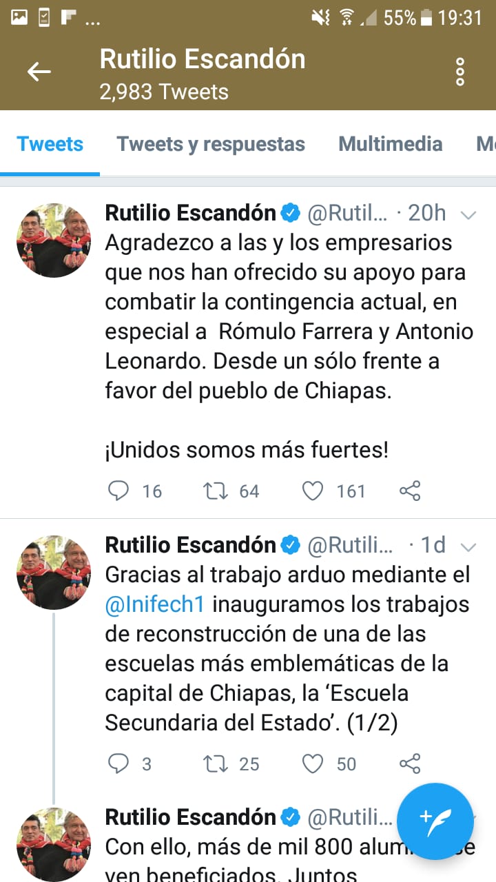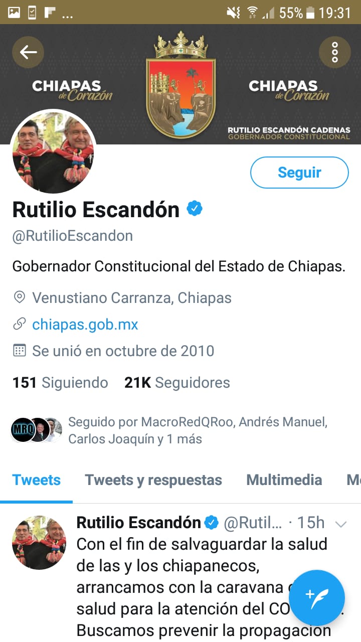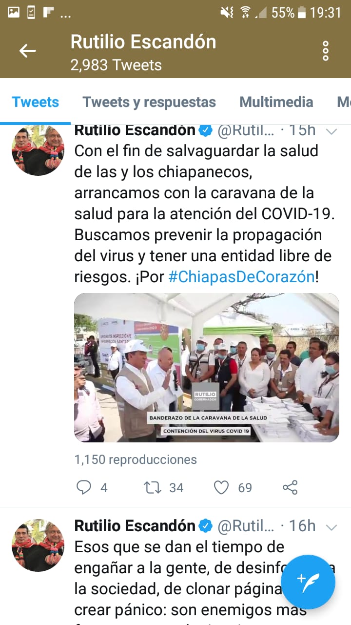 Por último revisamos la cuenta del gobernador de Chiapas Rutilio Escandón, la cual registra cinco tuits en las últimas 24 horas. Todos ellos con información sobre prevención de contagio y cuidados ante el Coronavirus. en uno de sus tuits hace hincapié sobre lo terrible que pueden llegar a ser las Fakes News: “Esos que se dan el tiempo de engañar a la gente, de desinformar a la sociedad, de clonar páginas y crear pánico: son enemigos más fuertes que cualquier virus, son delincuentes y no les vamos a dejar que ganen la batalla”.
