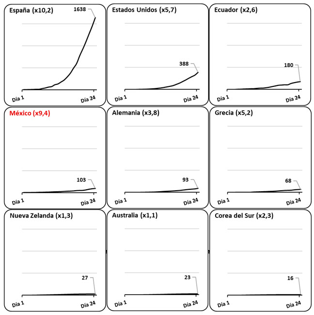 Por una parte, la trayectoria actual de la epidemia en México está muy lejos de la de los países con las incidencias más altas (Espana y Estados Unidos). Y es particularmente extraordinario que Estados Unidos, con todos sus recursos, con los mejores hospitales del mundo y con una excelente organización para la prevención de enfermedades (el CDC), no haya podído tramitar la epidemia mejor.