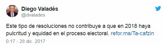 Una de las primeras y más notorias reacciones fue la del ex procurador General de la República, Diego Valadez, quien señaló en su cuenta de twitter “Este tipo de resoluciones no contribuye a que en 2018 haya pulcritud y equidad en el proceso electoral”