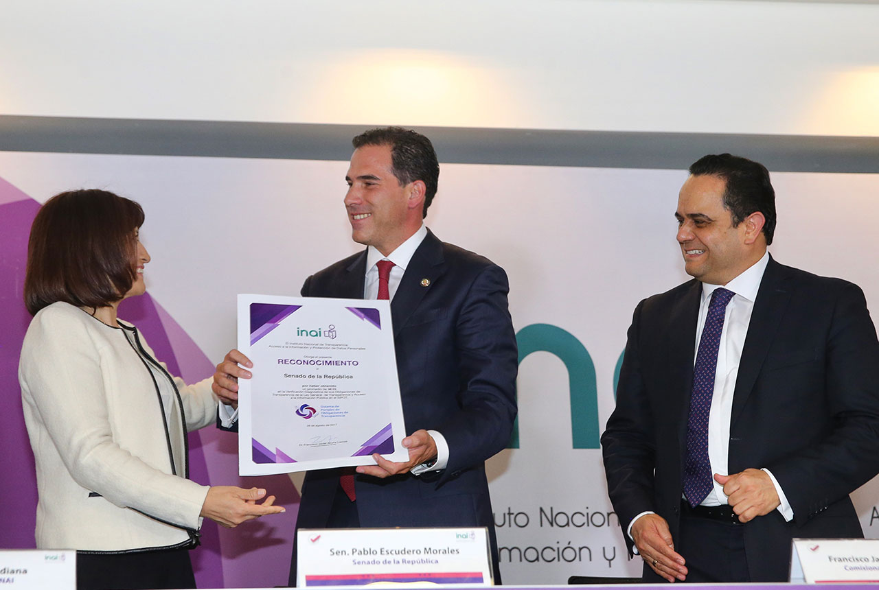 Al momento de recibir el presidente de la Mesa Directiva, Pablo Escudero Morales el reconocimiento que el Instituto Nacional de Acceso a la Transparencia y Protección de Datos Personales otorgó a la Cámara de Senadores por obtener una puntuación de 96.03 por ciento en el cumplimiento de sus obligaciones en la materia, dijo que en el segundo año de la LXIII Legislatura, la Cámara Alta redobló los esfuerzos institucionales para consolidarse como un referente en el cumplimiento de las obligaciones de transparencia.