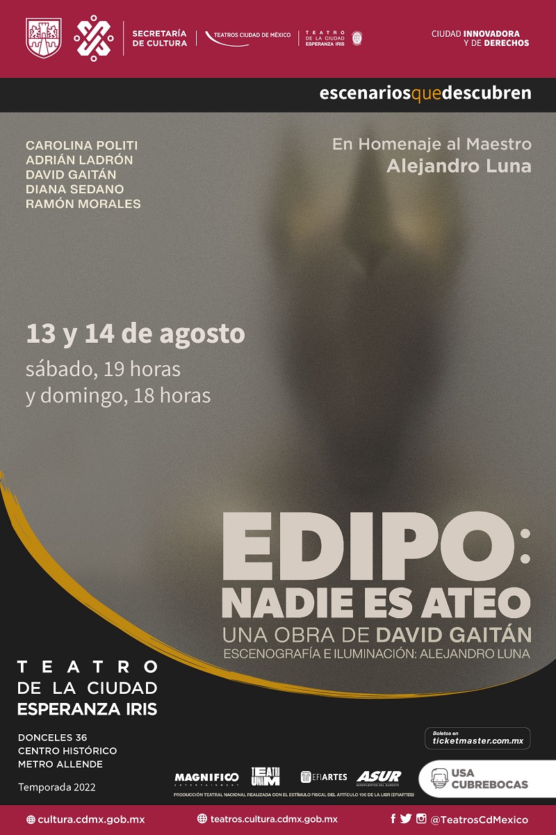 CIUDAD DE MÉXICO.- Ganadora en 2019 de los Premios Metropolitanos a la Mejor Adaptación y a la Mejor Dirección de escena, la puesta Edipo: nadie es ateo, escrita y dirigida por David Gaitán, ofrecerá dos funciones especiales en el Teatro de la Ciudad Esperanza Iris, de la Dirección del Sistema de Teatros de la Secretaría de Cultura de la Ciudad de México.
