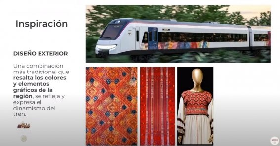 Durante la Mañanera, Jiménez Pons destacó se tratan de ferrocarriles “con la mejor tecnología para una óptima experiencia, respetuoso con el medio ambiente y con diseño de vanguardia”. Su exterior está inspirado en una combinación más tradicional que resalta los colores y elementos gráficos de la región, como las telas de la cultura maya.