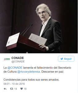 El órgano federal se pronunció ante este lamentable hecho por medio de Twitter en donde escribió: “La CONADE lamenta el fallecimiento del Secretario de Cultura… Descanse en paz.”