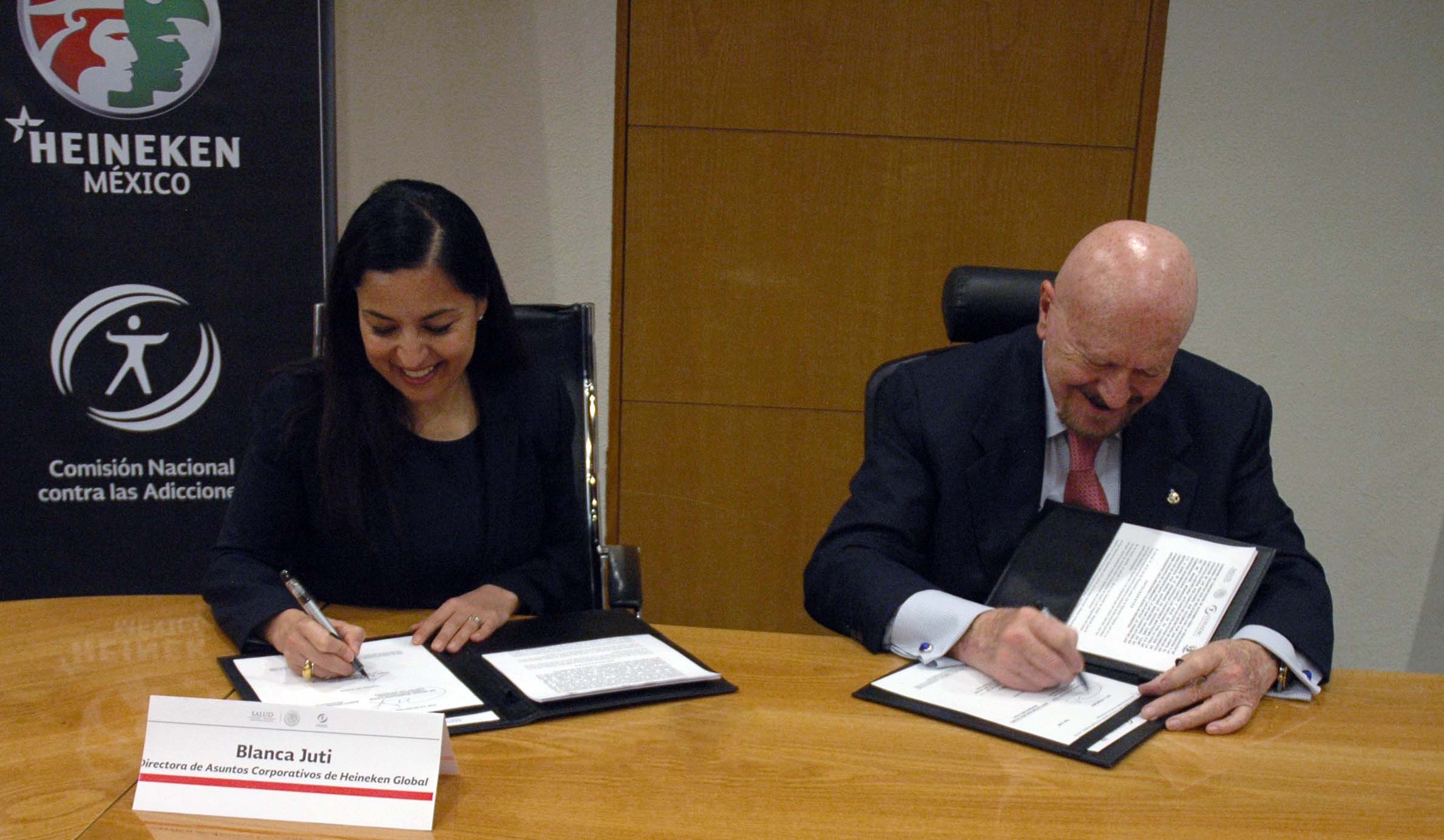 Blanca Juti, directora de Asuntos Corporativos de Heineken y el titular de la CONADIC, Manuel Mondragón y Kalb/ Foto: Comunicación Social Secretaría de Salud
