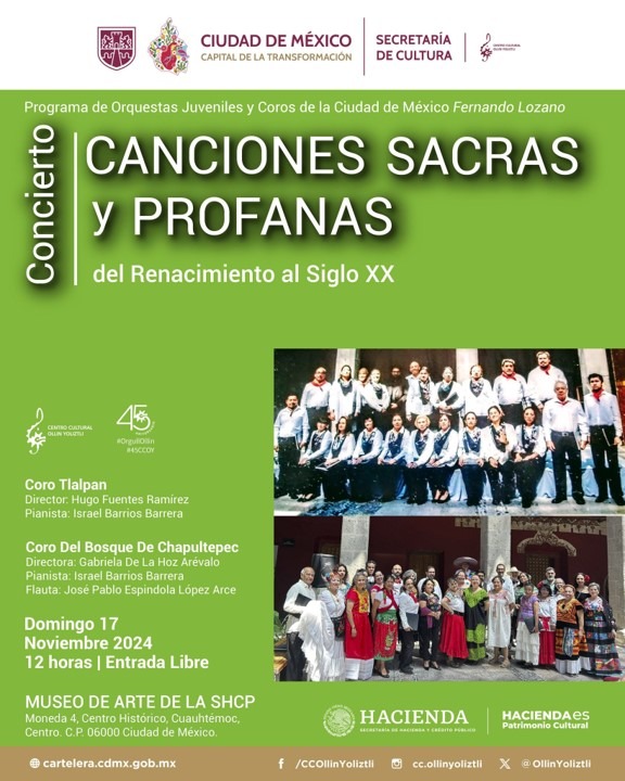 El Coro Tlalpan, bajo la dirección de Hugo Fuentes Ramírez, el Pianista: Israel Barrios Barrera y el Coro del Bosque de Chapultepec, con la dirección de Gabriela De La Hoz Arévalo, el Pianista: Israel Barrios Barrera y José Pablo Espíndola López Arce en la flauta, ofrecerán un concierto de música religiosa y popular del Renacimiento, Clasicismo, Romanticismo y siglo XX.
