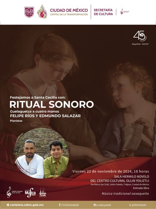 Si quieres disfrutar de la música que acompaña los festejos que Oaxaca dedica a Santa Cecilia, el próximo 22 de noviembre, en la Sala Hermilo Novelo del Centro Cultural Ollin Yoliztli, la Temporada de Música de Cámara presentará una muestra de la música tradicional Oaxaqueña con el espectáculo «Festejamos a Santa Cecilia con: Ritual Sonoro» con Felipe Ríos y Edmundo Salazar, quienes compartirán piano a cuatro manos.