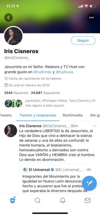 Luego de borrar el tweet, Iris Cisneros no comentó nada relacionado con su homofobia; sin embargo, continúa compartiendo publicaciones con tintes religiosos y muy “conservadores”.