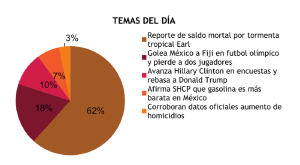 CIUDAD DE MÉXICO, 08 de agosto (Almomento MX/Intelicast).- Entre las noticias principales que se publican en los medios de comunicación, de acuerdo con el monitoreo informativo realizado por Intelicast, se encuentra que el coordinador Nacional de Protección Civil, Luis Felipe Puente, confirmó que oficialmente la tormenta tropical Earl dejó 38 personas muertas en Puebla y Veracruz.