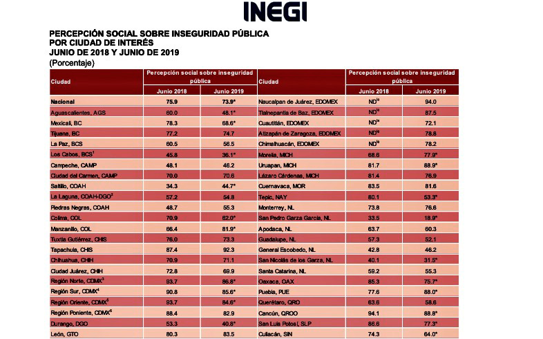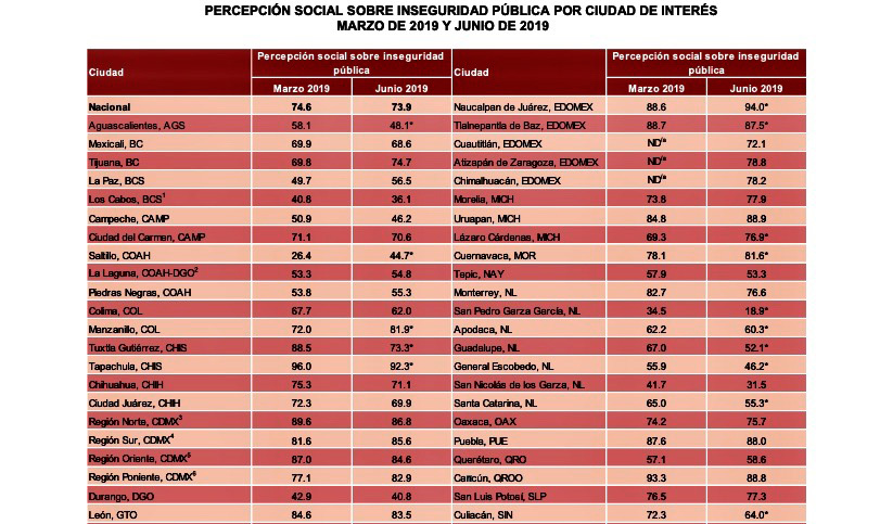 Por otro lado, las ciudades con menor percepción de inseguridad fueron: San Pedro Garza García, Mérida, San Nicolás de los Garza, Los Cabos, Durango y Puerto Vallarta, con 18.9, 30.2, 31.5, 36.1, 40.8 y 43.1%, respectivamente.