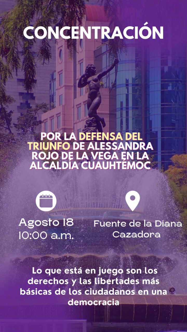 La candidata ganadora en la elección de la alcaldía Cuauhtémoc, Alessandra Rojo de la Vega, convocó a una concentración el próximo domingo 18 de agosto en defensa de su triunfo el 2 de junio pasado.
