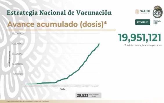 Ciudad de México-. Hasta el 5 de mayo de 2021, en México se aplicaron ocho millones 418 mil 291 esquemas completos de vacunación contra el virus SARSCoV2. El miércoles 5 de mayo se suministraron 512 mil 611 dosis.