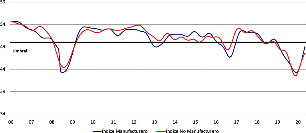47.6 unidades y, así, permanecer en zona de contracción por dieciocho meses seguidos. Por su parte, el Indicador ajustado por tamaño de empresa cayó 0.6 unidades para ubicarse en 48.9 unidades, con lo que permaneció en la zona de contracción por onceavo mes consecutivo.