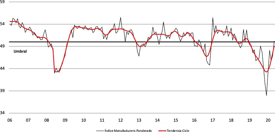 Las manufacturas, que representan más de la mitad de la producción industrial, han sido una de las ramas de actividad económica que más rápidamente se ha recuperado, lo que se explica por su vocación exportadora y la pronta recuperación de la economía estadounidense —hasta el momento—.