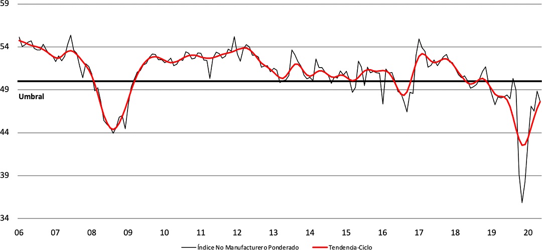 El Indicador IMEF No Manufacturero registró en octubre una caída de 1.1 puntos para cerrar en 47.7 unidades y ubicarse en zona de contracción por noveno mes consecutivo. La serie tendencia-ciclo de ese indicador aumentó 0.8 para quedar en 47.6 unidades y, así, permanecer en zona de contracción por dieciocho meses seguidos. Por su parte, el Indicador ajustado por tamaño de empresa cayó 0.6 unidades para ubicarse en 48.9 unidades, con lo que permaneció en la zona de contracción por onceavo mes consecutivo.