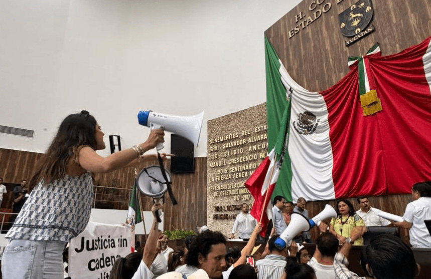 En Yucatán, la protesta se desató a mediodía, cuando trabajadores del Poder Judicial intentaron entrar a la fuerza al Congreso estatal. A pesar de los intentos de bloquear su acceso, los manifestantes lograron entrar al recinto, ondeando banderas tricolor y gritando consignas contra la Reforma Judicial. Su objetivo era detener la sesión en la que se discutía la reforma.