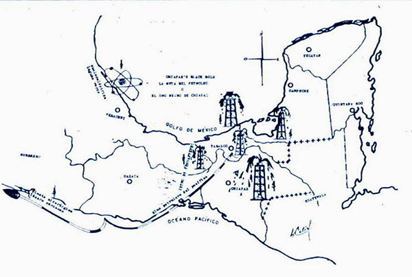 — Con puertos terminales cerca de Puerto México en el Río Coatzacoalcos y cerca de la boca actual de la Laguna Inferior en Oaxaca, en el Pacífico, sitúa.