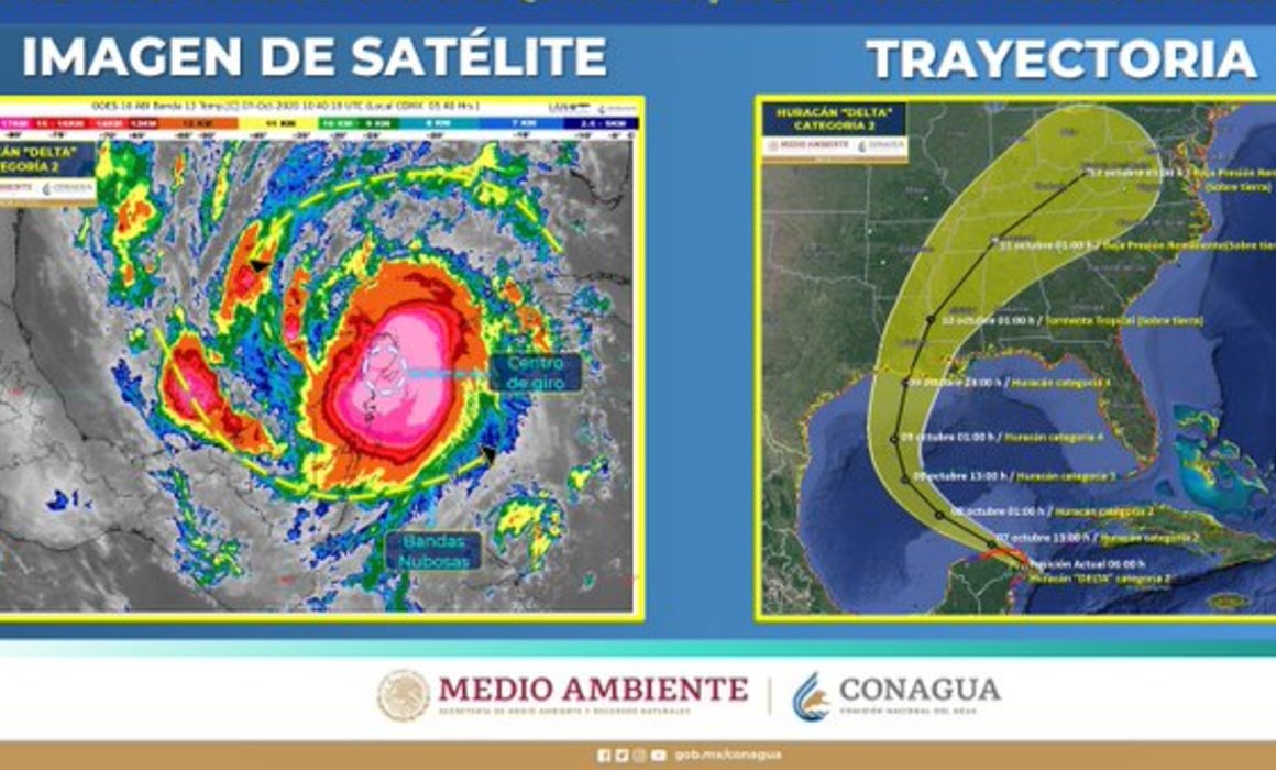 ⇒ De acuerdo con su último reporte, “Delta” se ubica a 55 kilómetros al oeste de Cancún y provocará lluvias de intensas a torrenciales en la Península de Yucatán.