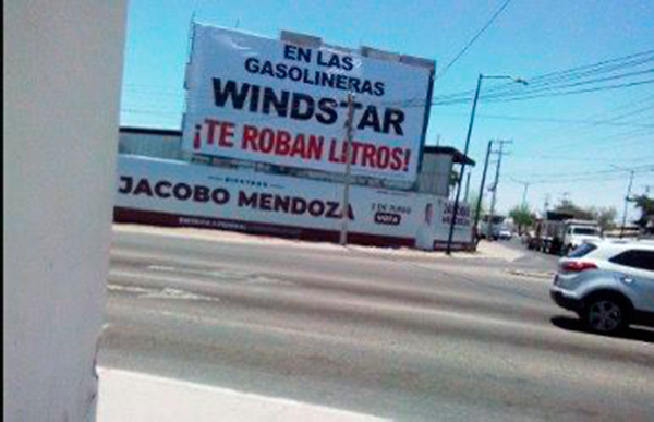 “En las gasolineras Windstar ¡te roban litros!” menciona el mensaje de los carteles publicitarios que se encuentran en calles como Boulevard Jesús García Morales 852 y Calle Carlos Quintero Arce 252 y que fueron difundidas a través de Facebook y X (antes Twitter).
